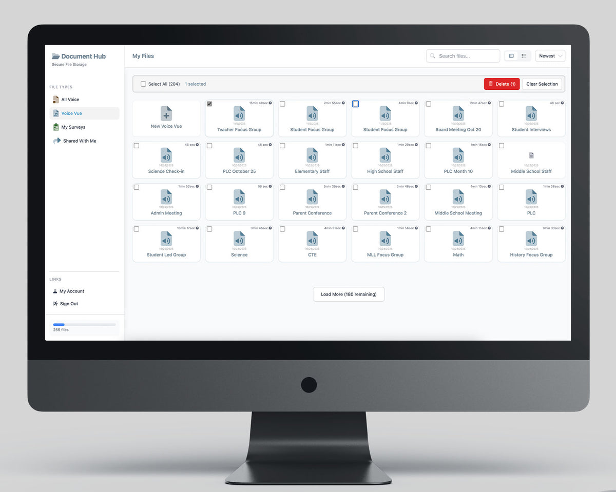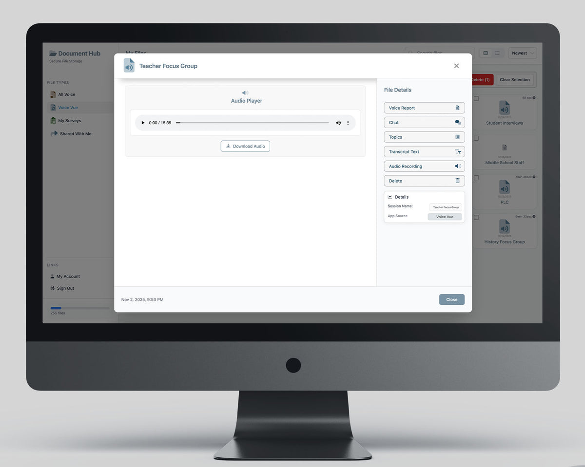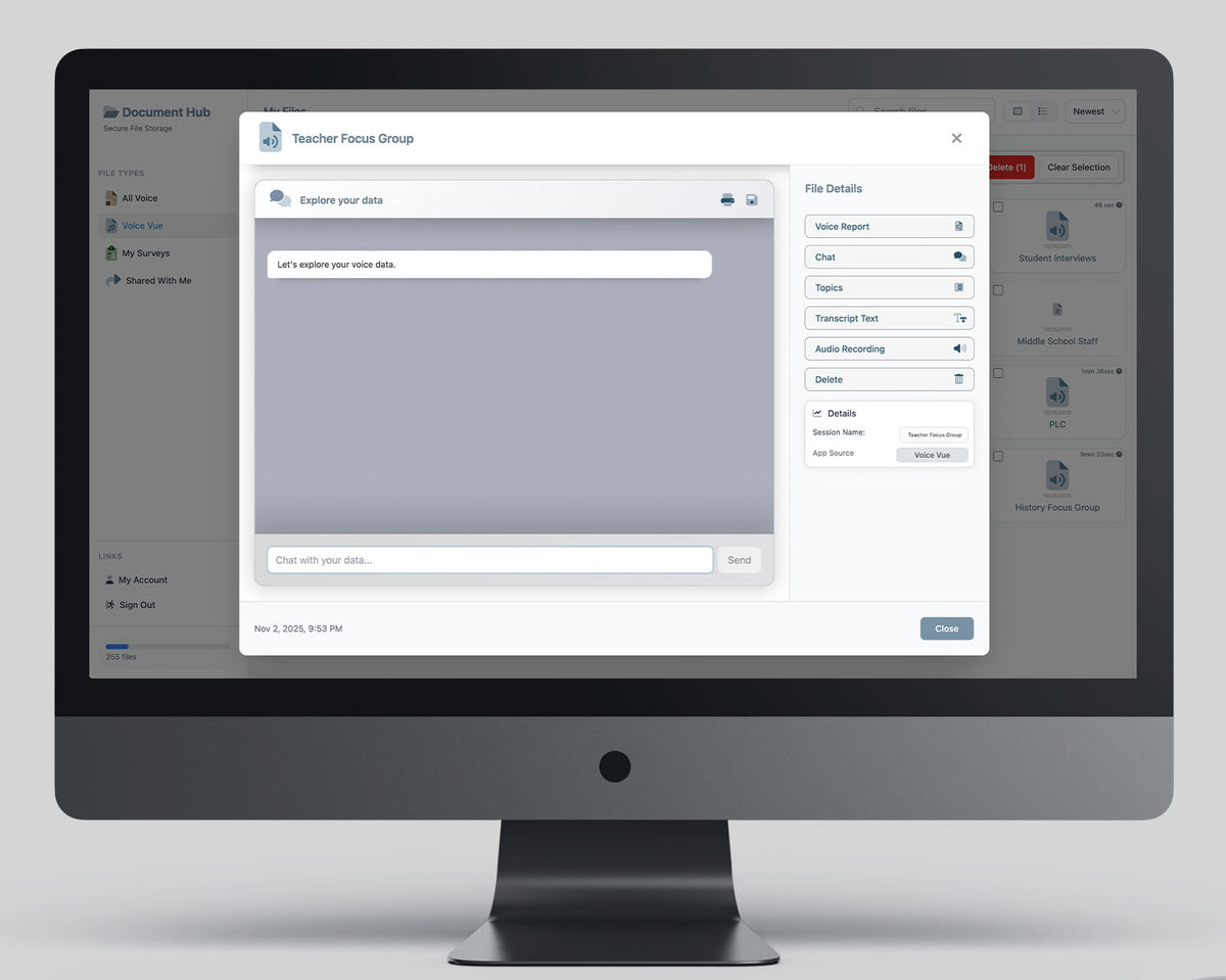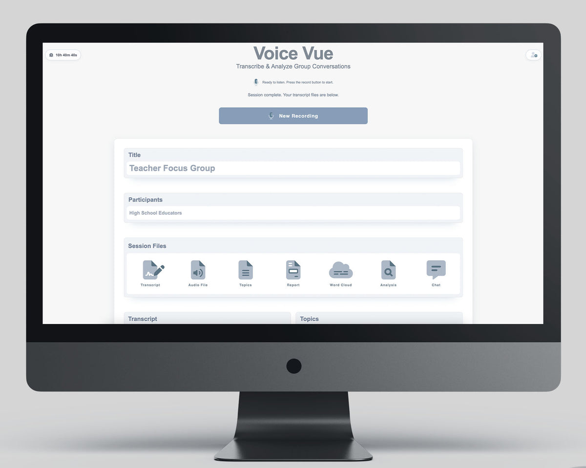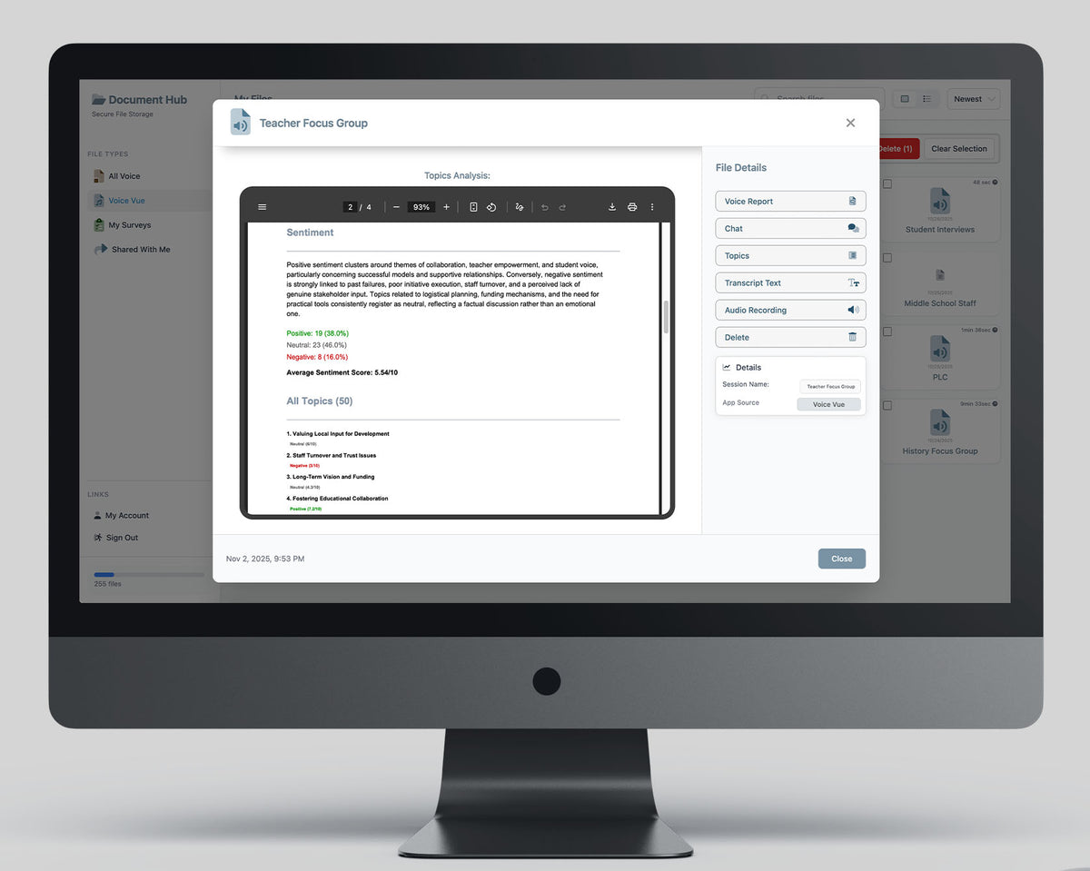 Works with any mobile device or computer. As the conversation unfolds, Voice Vue delivers instant sentiment insights and live follow-up prompts that help guide and enrich the discussion. When the session concludes, your dialogue is transformed into structured, searchable data, identified next steps, downloadable files, and a comprehensive voice report.