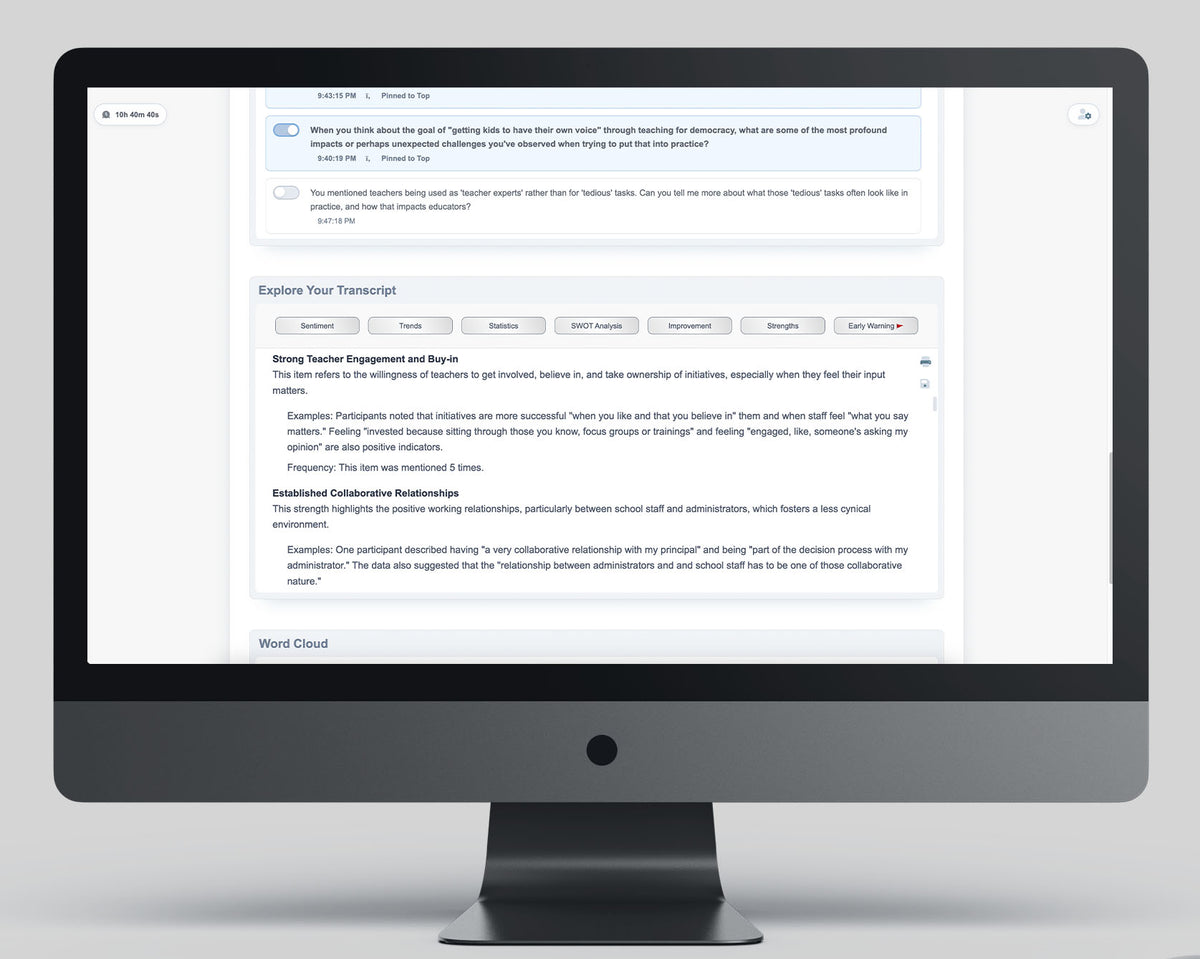 Experience real-time transcription and voice analysis during interviews, focus groups, and live discussions.